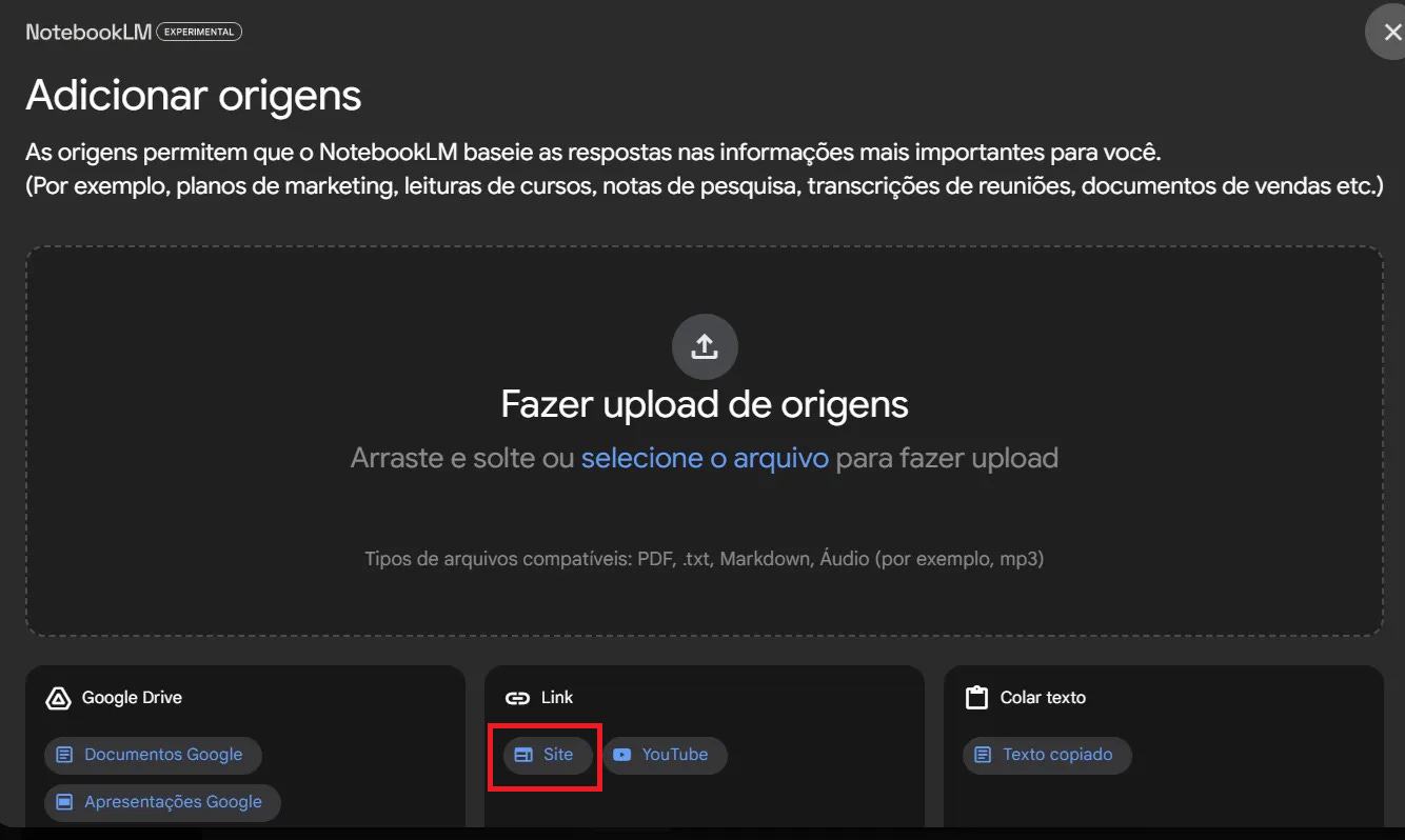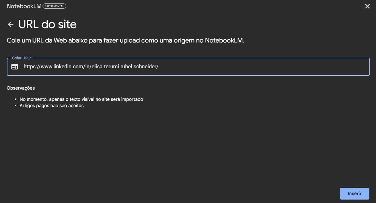 In "Add sources," choose the Link / Site option, paste your LinkedIn profile URL, and click Insert, as shown in the images below: