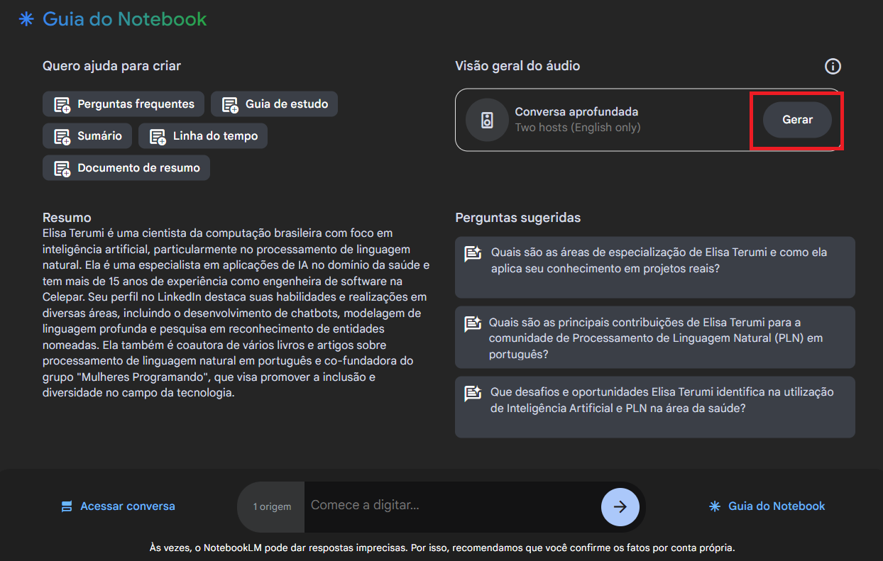 The tool should have opened the “Notebook Guide” screen, and now you just need to click the Generate button to create the podcast (in English).