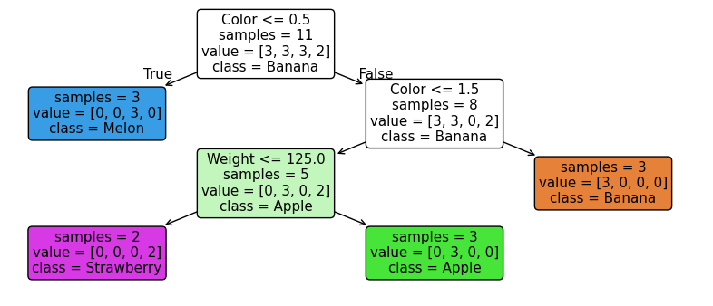 plot_tree(clf, filled=True, feature_names=["Weight", "Color", "Shape"], class_names=["Banana", "Apple", "Melon", "Strawberry"], rounded=True, impurity=False)