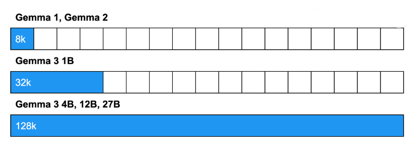 Gemma 3 was designed to handle long contexts of up to 128,000 tokens in the larger models (12B and 27B), enough to analyze an entire novel, 500 images, or perform analysis on extensive documents.