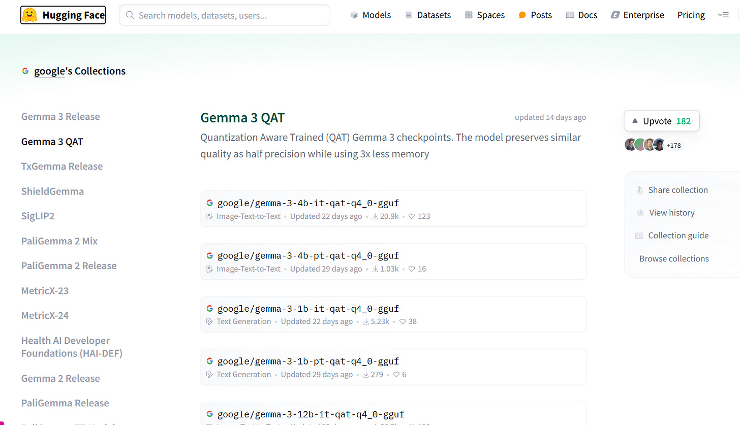 Google also released quantized models with QAT (Quantization-Aware Training), optimized to run on consumer GPUs, local TPUs, and mobile devices.