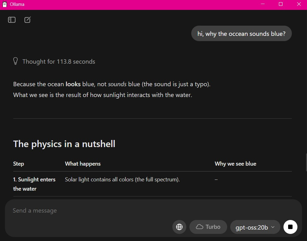 When you send the first question, the program will download the model locally (this may take some time, as it is 12GB!) and after that, it will be ready to respond.