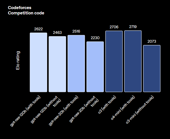 Programming: The 120B model outperformed the o3-mini (in the “without tools” scenario) and rivaled the o4-mini.