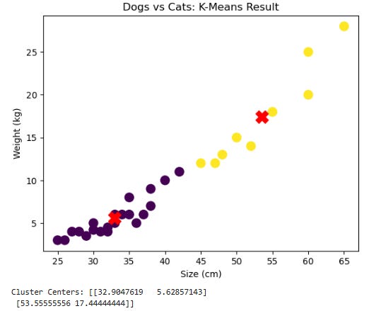 The K-Means algorithm was set to create 2 clusters (one for dogs and the other for cats)