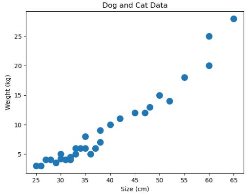 Size (cm) and Weight (kg) were the two features created for the dog and cat examples