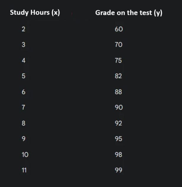 # Example data (the table with study hours and test scores)